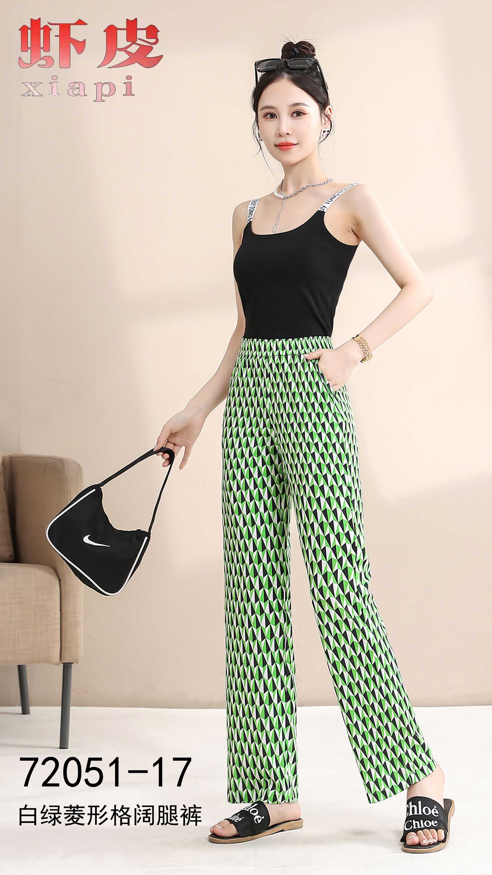 白绿菱形格阔腿裤1